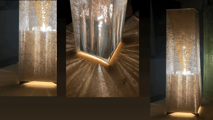 We use layered metal fabrics and other media, including real flower blossoms and leaves, to create vessels which refract, reflect and project light.
